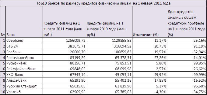 6 место по объему выданных кредитов физическим лицам