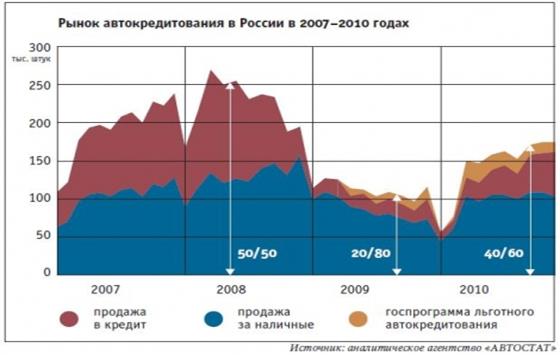 Таким образом, 2010 год оказался для сегмента автокредитования достаточно удачным. Как сообщает аналитическое агентство «АВТОСТАТ», доли продаж в кредит вплотную приблизились к уровню 2008 года. В 2008 году примерно 50% автомобилей продавалось в кредит, во время кризиса (в 2009 году) доля «кредитных» автомобилей упала до 20%. В настоящее время до 40% новых автомобилей продается в кредит. Правда, объемы продаж в целом еще достаточно сильно отстают от того же 2008 года и находятся приблизительно на уровне 2006 года. Однако большинство банкиров уверены в значительном росте портфелей автокредитов в 2011 году[28].