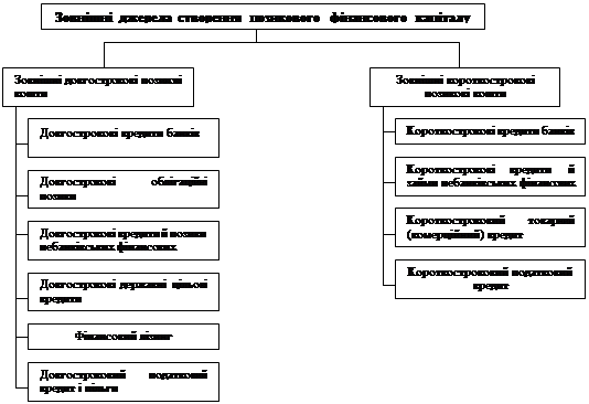 Перша група – зовнішні джерела позикових коштів. Ця група джерел складається з двох підгруп – зовнішні довгострокові й зовнішні короткострокові джерела позикового фінансового капіталу (рис.1)