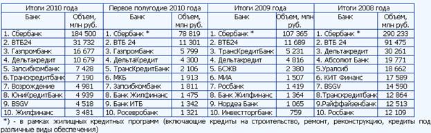 В начале 2010 года рынок ипотеки стал подавать признаки жизни. За достаточно короткий срок об улучшении условий кредитования объявили Сбербанк, ВТБ 24, Газпромбанк, «Дельта кредит», Оргрэсбанк, Юникредит банк, ОТП-банк, ИТБ-банк, НДБ-банк, «Абсолют банк», Связь-банк, «Банк Сосьете Женераль Восток», СКБ-банк, Росевробанк, Райффайзенбанк, Московский кредитный банк.