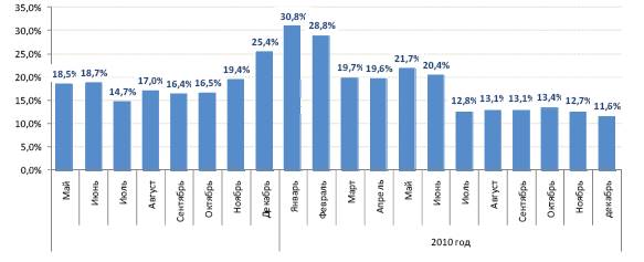 Рисунок 3.5. Ставки по ипотечным кредитам в рублях, выданным в течение месяца (2009-2010 гг), %