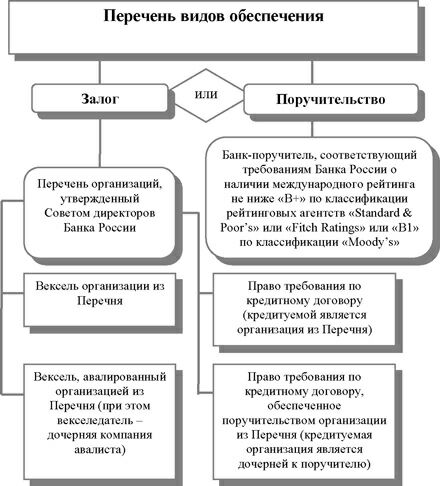Банк России предоставляет кредитным организациям возможность получения кредита под залог векселей (прав требования по кредитным договорам) или под поручительства кредитных организаций на срок до 180 календарных дней, при этом допускается его досрочное погашение. В настоящее время указанным механизмом могут воспользоваться кредитные организации, имеющие открытые корреспондентские счета или корреспондентские субсчета в территориальных учреждениях Банка России 25 регионов Российской Федерации. Потенциальному банку-заемщику необходимо передать соответствующие документы для рассмотрения Банком России вопроса о заключении договора, предоставление бухгалтерской отчетности организаций не требуется. Срок рассмотрения заявки составляет до 8 дней. В настоящее время процентные ставки установлены в размере 7% годовых на срок до 90 календарных дней и 8% годовых на срок от 91 до 180 календарных дней. В целях снижения риска введены поправочные коэффициенты для корректировки стоимости принимаемого в обеспечение имущества (0,5 для имущества I категории качества; 0,3 - для имущества II категории качества). Перечень организаций, чьи обязательства принимаются в обеспечение по кредитам, формируется на основе данных, публикуемых несколькими международными рейтинговыми агентствами, и утверждается Советом директоров Банка России. Возможные варианты принимаемого обеспечения приведены на следующей схеме: