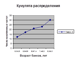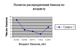 Вывод: проанализировав данную группировку можно сделать вывод о том, что преобладают банки в возрасте от 5,0 до 5,8 лет (12 банков), с величиной капитала от 0,78 до 1,402 млн. руб.