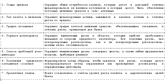 Структура кредита логически основывается на вышеупомянутых элементах. На основе результатов анализа кредитный инспектор должен оптимально определить: сумму кредита; тип и стоимость залога; график погашения; порядок мониторинга; список требуемой документации; положения кредитного соглашения (условия); процентную ставку.