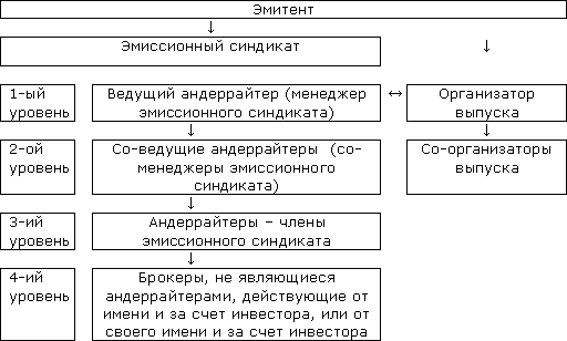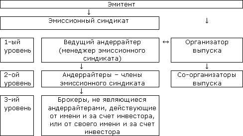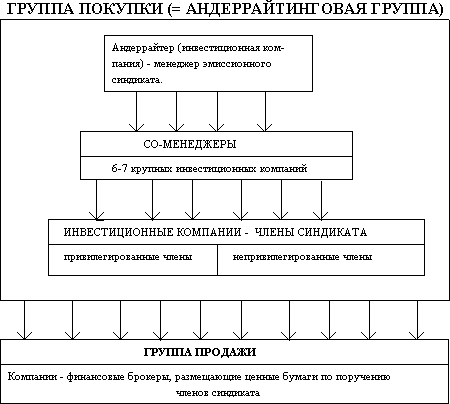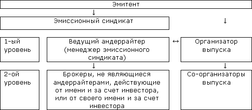 Обычно андеррайтинг осуществляет не один профессиональный участник рынка ценных бумаг, а их группа, то есть создается эмиссионный (андеррайтинговый) синдикат .