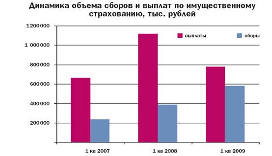Прогнозы. Эксперты «bc» отмечают, что восстановление рынка имущественного страхования будет зависеть от активности банковского сектора, а также динамики макроэкономических показателей, в первую очередь – доходов населения и уровня безработицы. Перспективы улучшения ситуации оцениваются ими по-разному. Прогнозы развития ситуации на рынке имущественного страхования до конца 2009 года неутешительны: в частности, «Эксперт РА» ожидает сокращение объема сборов в этом сегменте на 28% (рынок страхования – в целом на 18%). При этом следует ожидать, что основной спад придется на сегмент малого и среднего бизнеса, поскольку более устойчивые в финансовом плане крупные компании, вероятнее всего, сохранят страховую защиту на прежнем уровне. Свои оценки сложившейся ситуации опубликовала в своем исследовании и аудиторская компания «Мариллион». По ее прогнозам, нестабильная фаза развития страхового рынка продлится в течение года. Сокращение объема собранных премий на 15–21% (без учета страхования жизни) при одновременном обесценении активов и росте рисков контрагентов, вероятно, приведет к недорезервированию средств и кризису ликвидности. Также в конце мая агентство Fitch Ratings присвоило «Негативный» прогноз по российскому страховому сектору, что отражает отрицательное воздействие ухудшающейся ситуации на страховом рынке в связи с быстрым замедлением российской экономики и сохраняющейся волатильностью на инвестиционных рынках страны. Страховой рынок – это рынок финансовых услуг. И проблемы финансового рынка не могли не затронуть рынок страхования. Первые проявления кризиса стали заметны уже в ноябре 2008 года. В первую очередь он обозначился на рынке банковских услуг и ритейловых продаж. В связи с уменьшением объемов автокредитования резко упали продажи автотранспорта в салонах и, соответственно, уменьшился объем страховых взносов по транспорту. Рассмотрим динамику объема сборов и выплат по имущественному страхованию, представленную в виде диаграммы.[10]