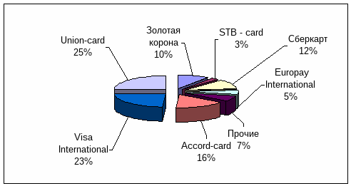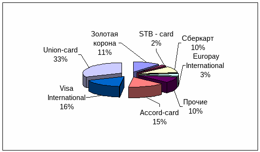 Таким образом рынок пластиковых карт вписывается в модель «бостонская матрица». На рынке присутствуют «звезды» в лице международные системы; и «дойные коровы», обреченные, кто-то раньше, кто-то позже стать «собаками». К «дойным коровам-собакам» отнесем локальные карточные продукты. Данное развитие событий неизбежно. Однако в России есть сегмент рынка, который труднодоступен для международных систем. Этот сегмент достанется как раз «собакам». К этому сегменту можно отнести различные платежи локального характера (свет, газ, коммунальные услуги, телефон и т.д.).