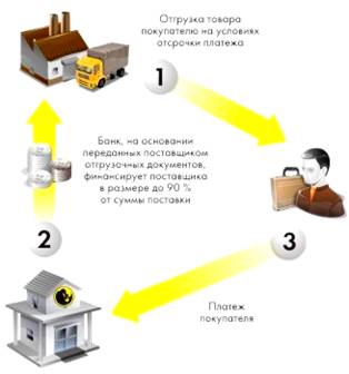 Схема работы «умного факторинга» очень проста: предприятие поставляет товар покупателю на условиях отсрочки платежа (до 90 дней), а право требования долга по поставке уступает банку. Дебитор при наступлении срока платежа уплачивает сумму задолженности по поставке банку. Банк-фактор, в свою очередь, выплачивает поставщику до 90% стоимости товара сразу после поставки, а оставшиеся 10% за вычетом вознаграждения - после оплаты товара покупателем. (см. рис.2.2.1)[11]