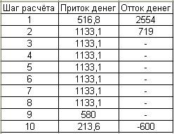 ЧДД=(516,8/(1+0,255))+(1133,1/(1+0,255)^2)+(1133,1/(1+0,255)^3)+(1133,1/(1+0,255)^4)+(1133,1/(1+0,255)^5)+(1133,1/(1+0,255)^6)+(1133,1/(1+0,255)^7)+(1133,1/(1+0,255)^8)+(580/(1+0,255)^9)+(213,6/(1+0,255)^10)-(2554/(1+0,255))+(719/(1+0,255)^2) = 1749