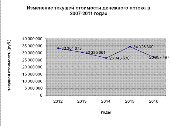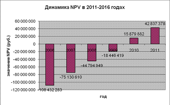 Для рассматриваемого проекта значение NPV в первые четыре года реализации проекта является величиной отрицательной и составляет в 2011 году - -107 014 628 рублей, в 2012 году – -123 243 561 рублей, в 2013 году – -74 665 266 рублей и в 2014 году – -21 984 409 рублей. Начиная с 2015 года, NPV начинает принимать положительные значения и составляет в 2015 году – 35 124 256 рублей, в 2016 году – 107 754 516 рублей. Вследствие того, что в 2015-2016 годах значение NPV является положительным, то данный проект окупается, приносит доходность и его следует принять.