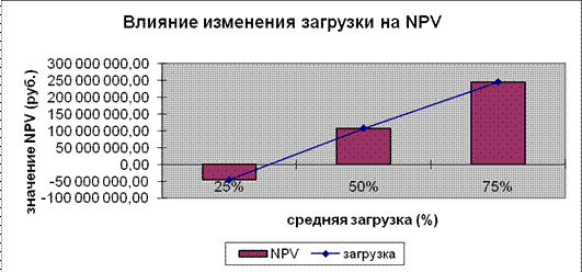 Предполагается, что исходная планируемая загрузка комплекса составляет в среднем 53.4% в год. При этом значение NPV равно 107 754 516 рублей, срок окупаемости составляет 3,38 года и значение IRR составляет 43.5%. Проведем анализ изменения загрузки комплекса, повышая и понижая данный уровень загрузки на 25%.