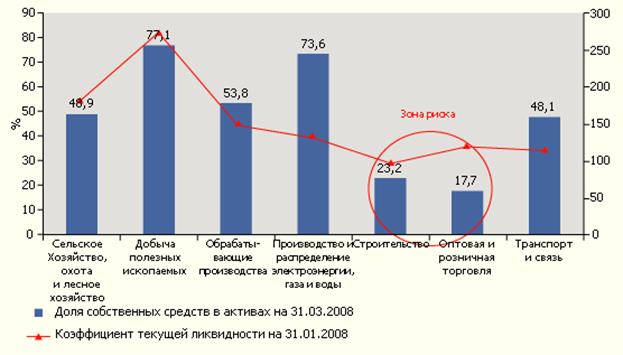 Речь идет, прежде всего, прежде всего, о торговых и строительных предприятиях, а именно эти отрасли стали одними из самых кредитоемких в 2005-2007 годах. Сегодня эти два сектора экономики характеризуются одними из наиболее низких уровней самофинансирования (доля собственных средств в активах) и текущей ликвидности (см. график 1). По данным мониторинга, проведенного Банком России, в конце первого квартала 2008 г. 82,3% активов предприятий оптовой и розничной торговли приходилось на привлеченные средства.