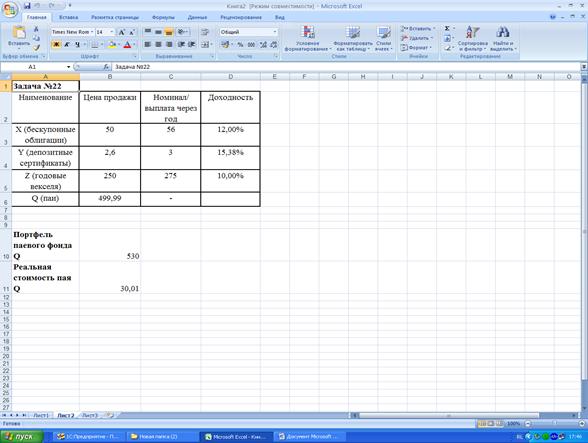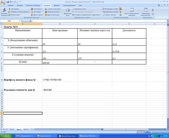 Ответ: Наличие дизбаланса цен на активы, входящие в портфель паевого фонда Q, показывает, что на данном рынке существует возможность арбитража. Т.е. возможно получение безрискового дохода в пределах суммы равной 30,01. Купив пай ПИФа Q по цене 499,99 и продав его по частям получаем 30,01 прибыли используя арбитраж рынка, которую выгодней всего вложить в депозитные сертификаты банка У, с доходностью 15,38% годовых.