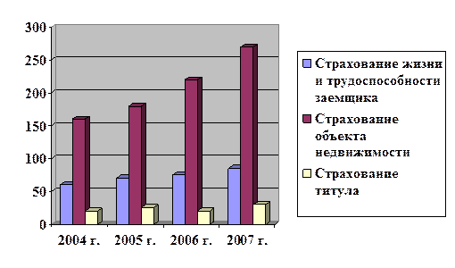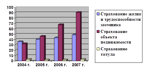 По рисунку 3 видно, что основную долю в ипотечном страховании продолжает занимать страхование самого объекта недвижимости. Размер его премий в ипотечном страховании составил в 2007 году около 270 млн. руб., что составило 71% от общей суммы премий. На втором месте находится страхование жизни и трудоспособности заемщика. В 2007 году размер этого вида страхования составил около 80 млн. руб., его доля составила 21%, существенно уступая первому. А страхование титула в 2007 году составило около 30 млн. руб. или 8% от общей суммы премий. Динамичное увеличение страховых премий по данным видам ипотечного страхования свидетельствует о развитии рынка ипотечного страхования достаточно быстрыми темпами. Тем не менее, распределение страховых премий по видам страхования остается с годами примерно одинаковым, что свидетельствует о достаточно низком уровне востребованности дополнительных к страхованию недвижимости услуг.