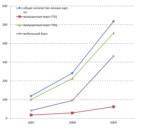 Положительным моментом является то, что за 2009 год возрос объем услуги «Мобильный банк», который дает возможность оперативного доступа к информации по банковским картам при помощи мобильного телефона.
