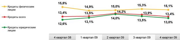 Доходность операций кредитования сократилась во втором полугодии 2009 года с 14,2% до 13,4%, что отражает рыночные тенденции по снижению процентных ставок (в основном по корпоративным клиентам) и высокую конкуренцию в сфере привлечения качественной клиентуры.