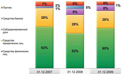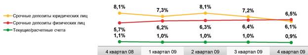 Наблюдаемое на рынке снижение стоимости ресурсов привело к удешевлению стоимости депозитов, привлеченных Банком от юридических лиц, на 2,0 п.п. во втором полугодии 2009 года.