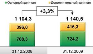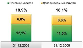Высокий уровень достаточности капитала Группы: показатель достаточности общего капитала Группы, рассчитанный в соответствии с Базельским соглашением о капитале, по состоянию н а 31.12.2009 составляет 18,1% и значительно превышает нормативное значение 8%. Норматив достаточности капитала Банка, рассчитанный в соответствии с требованиями Банка России без учета событий после отчетной д аты (СПОД) по состоянию на 31.12.2009 остается на высоком у ровне и составляет 23,2%