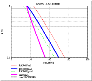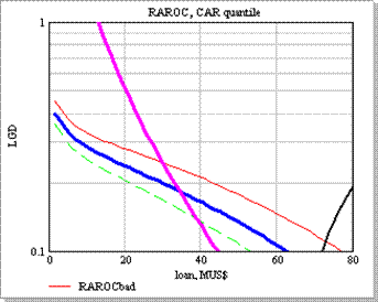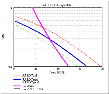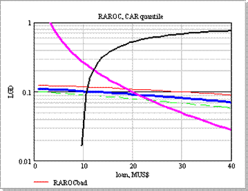Рассмотрим по отдельности каждую из них. Величина кредита ограничена в основном кривой максимального CAR, поскольку сумма кредита может быть достаточно велика. Видно, что этому заемщику можно выдать кредит в 40 MUS$ без обеспечения, с минимальной маржей (3%) на 3 года, однако, уже за кредит в 50 MUS$ необходимо потребовать обеспечения в 20%, (1-LGD) 100%.