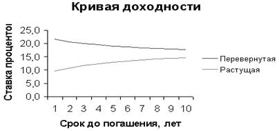 Для графического изображения такой зависимости по оси ординат откладывается уровень процентной ставки, по оси абсцисс — время до погашения. При различных состояниях рынка эта зависимость, называемая также временной структурой процентных ставок, или кривой доходности, может иметь различную форму.