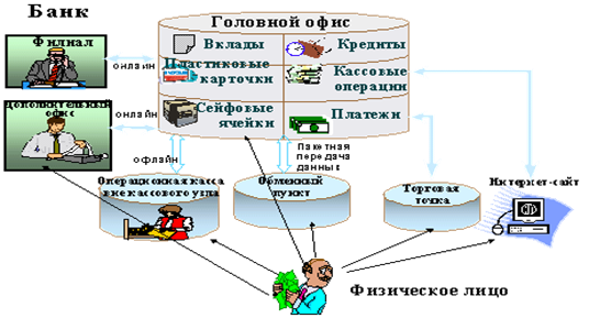 Наращивая объем операций, связанных с предоставлением розничных банковских услуг, кредитному учреждению предстоит позаботиться о создании сети дополнительных офисов, операционных касс и обменных пунктов, а также обеспечить возможность удаленного управления счетами через Интернет. Четкая работа всех подразделений, участвующих в процессе обслуживания физических лиц, немыслима без организации оперативного обмена данными (Приложение А).