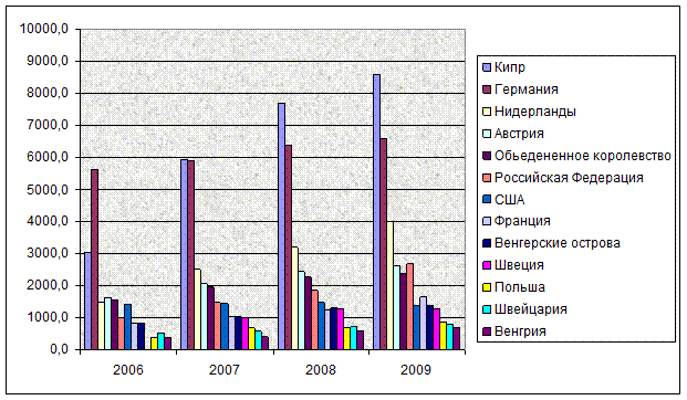 В 2009 году увеличились объемы капитала с Кипра ( на 910,3 млн. дол. США), Российской Федерации ( на 823,0 млн. дол. США), Нидерландов (на 821,2 млн. дол. США), Франции (на 414,0 млн. дол. США ), которые обеспечили почти 74% прироста иностранного капитала в Украину.