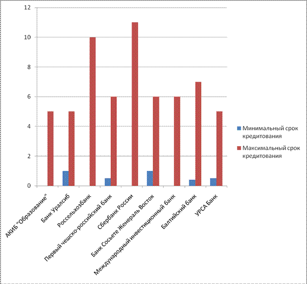 Относительно сроков кредитования можно сказать следующее. Наиболее продолжительный срок кредитования (10-11 лет) предлагают ОАО «Россельхозбанк» и Сбербанк России, а наименьший (до 5 лет),— ОАО «Акционерный коммерческий инновационный банк «Образование», ОАО «Банк УРАЛСИБ» и ОАО «УРСА Банк». Если говорить о сроках кредитования в валюте ($), то картина следующая: максимальный срок кредитования (10-15 лет) предоставляют ОАО «Россельхозбанк» и ОАО «Акционерный коммерческий банк «СОЮЗ», а минимальный (до 5 лет) — ОАО «Банк УРАЛСИБ».