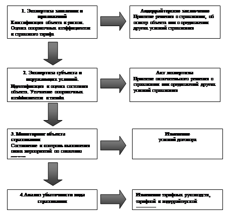 -проверку и подтверждение страхового интереса страхователя; оценку приемлемости заявляемых на страхование риском; установление числовых значений повышающих (понижающих) поправочных коэффициентов, учитывающих наличие (отсутствие) факторов, существенно влияющих на вероятность наступления и тяжесть последствий страхового случая;