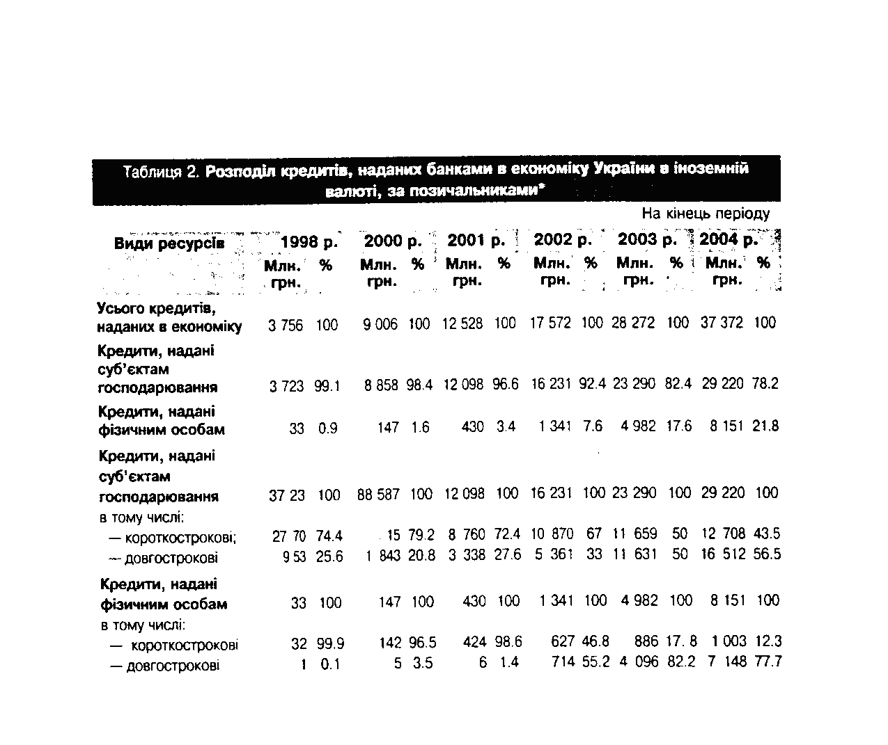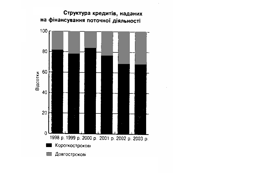 В настоящее время в Украине абсолютное большинство кредитов, которые предоставляются коммерческими банками - краткосрочные. В период с 1995 к 2002 году объем краткосрочных кредитов вырос в 8 раз, в частности в 1995 году он составлял 3643 млн. грн., а в 2002-м - 29538 млн. грн. На конец января 2003 года объем кредитов в экономику Украины составлял 41106 млн. грн., из них объем краткосрочных и долгосрочных кредитов, предоставленных коммерческими банками, составлял соответственно 28992 млн. грн. и 12114 млн. грн.8 Следовательно, объем краткосрочных кредитов, предоставленных коммерческими банками, почти у 2,4 раза больше. Это объясняется тем, что долгосрочные кредиты ризикованіше для банка в связи с нестабильным экономическим положением в Украине, неизвестными перспективами валютного курса гривни, сравнительно высоким уровнем инфляции и другими не прогнозируемыми внешними факторами (поведение инвесторов, отношения с МВФ и тому подобное).