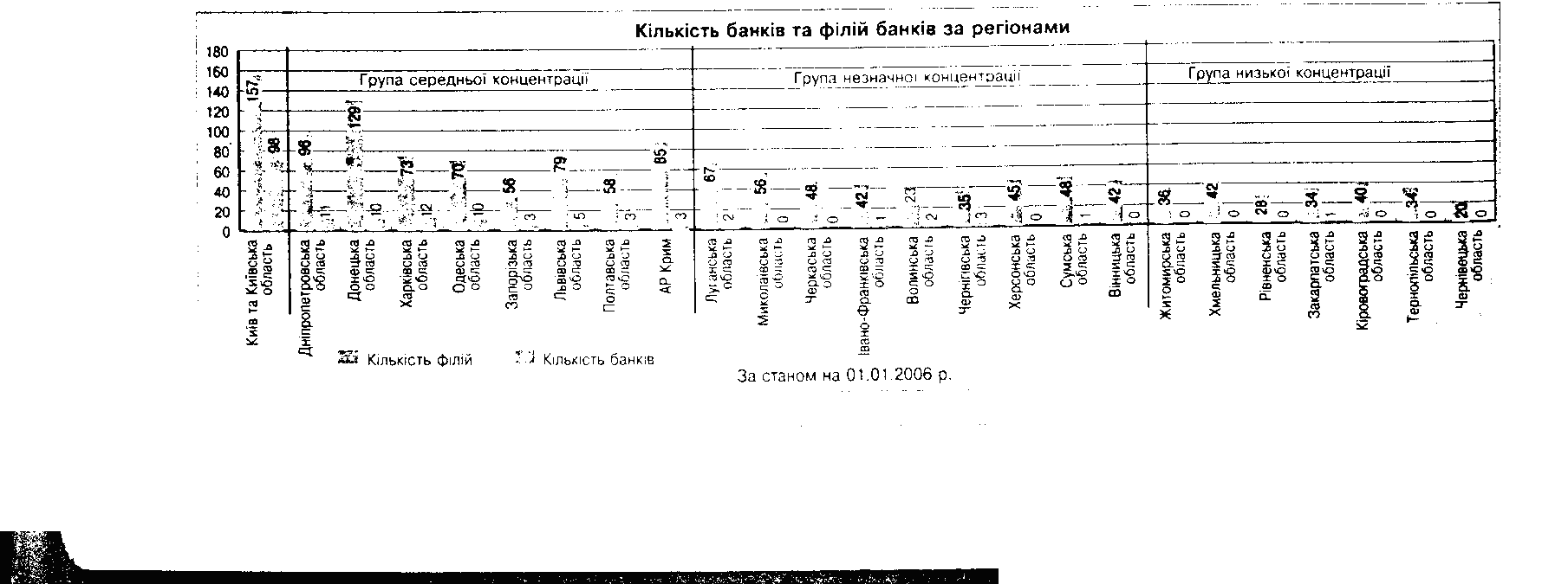 На протяжении последних лет прослеживается позитивная динамика основных показателей банковской деятельности. За период 1995-2002 годов капитал банковской системы Украины вырос у 6,3 раза, с 1580 млн. грн. в 1995 году до 9981 млн. грн. в 2002-му5. С 1995 года до 2002-го кредиты, предоставленные коммерческими банками, выросли в 10 раз, в частности в 1995 году они составляли 4078 млн. грн., а в 2002-м - 41199 млн. грн., среди которых преобладают кредиты, предоставленные в национальной валюте, и составляют 23912 млн. грн., а в иностранной - 17287 млн. грн. На конец января 2003 года кредиты, предоставленные коммерческими банками в национальной и иностранной валютах, составляли соответственно 23700 и 17406 млн. грн. Среди регионов с наибольшими объемами кредитования можно назвать: г. Киев (занимает первое место - 17619 млн. грн.), Днепропетровскую, Донецкую, Харьковскую и Одесскую области, предоставленные кредиты в которых на конец января 2003 года составляли соответственно 4736, 3189, 2269 и 1804 млн. грн.7