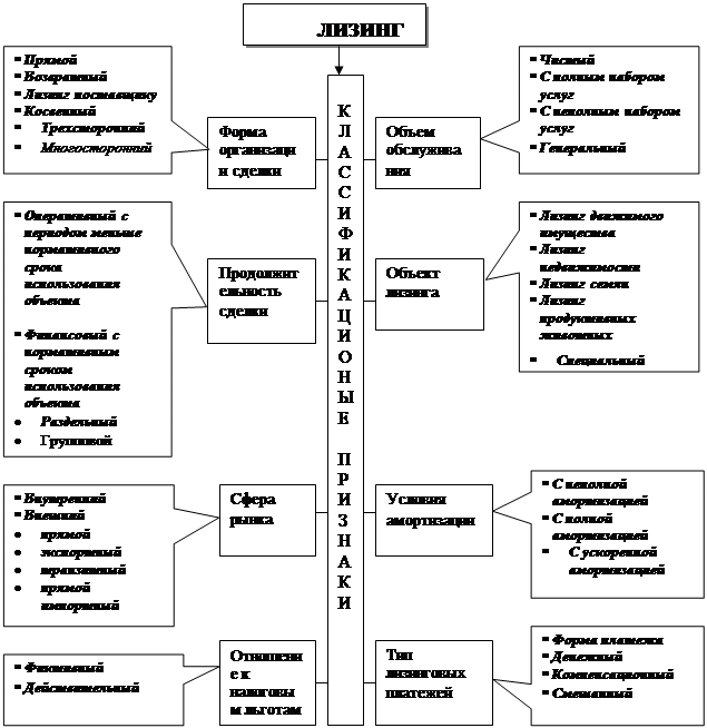 При выделении видов лизинга исходят прежде всего из признаков классификации. К таким признакам относятся: состав участников сделки, тип передаваемого в лизинг имущества, степень его окупаемости, условия амортизации, объем обслуживания, сектор рынка, где проводятся операции, отношение к налоговым и амортизационным льготам, характер лизинговых платежей.