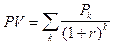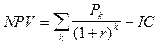 Допустим, делается прогноз, что инвестиция (IC) будет генерировать в течение n лет, годовые доходы в размере P1 , P2 , ..., Рn . Общая накопленная величина дисконтированных доходов (PV) и чистый приведенный эффект (NPV) соответственно рассчитываются по формулам [5] :