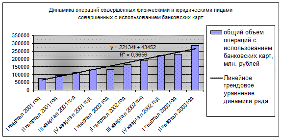 По представленным данным проведем анализ количества пластиковых карточек используемых для совершения операций физическими и юридическими лицами в совокупности. Для этого построим диаграмму, отражающую изменения общего числа карт во времени (см. рис. 2.2.).