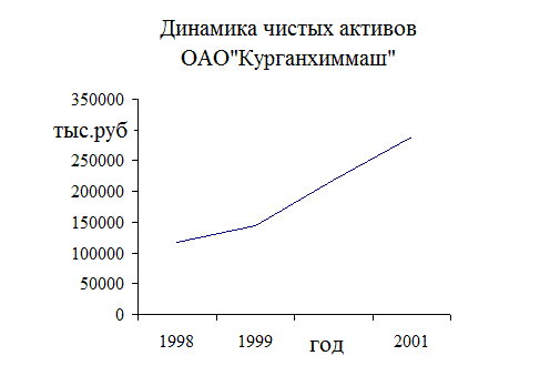 Основной показатель развивающегося и эффективного производства – прирост стоимости чистых активов. Величина чистых активов ОАО «Курганхиммаш» увеличилась с 116437 тыс.р. в 1999 году до 288925 тыс.р. в 2001 году. Фактически чистые активы ОАО «Курганхиммаш» превышают указанную нормативную величину.