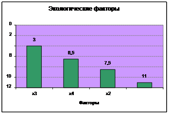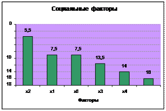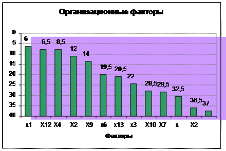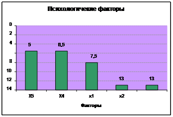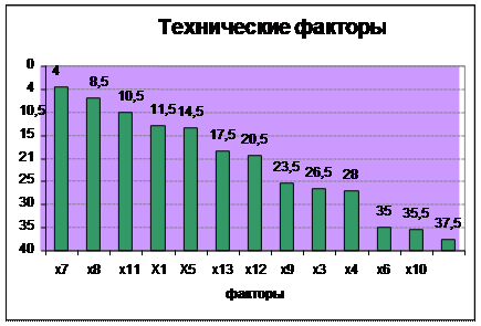 Для наглядности полученных результатов оценок факторов построим гистограмму распределения сумм рангов значимости изучаемых факторов. Гистограмма – это ступенчатая фигура, состоящая из прямоугольников. Гистограмма строится сверху. По оси абсцисс откладываются соответствующие факторы, по оси ординат – соответствующие им суммы рангов.