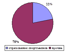 Страхование спортсменов на сегодняшний день учитывается в подотрасли личное страхование отличное от страхования жизни, и составляет 22% от суммы страховых премий. За анализируемый период доля страховых премий по страхованию спортсменов снизилась на 3%.
