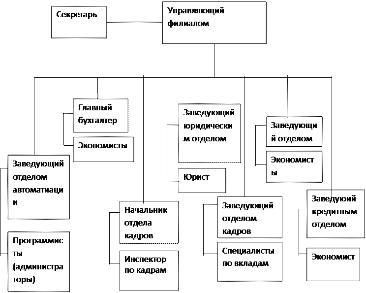 В организационную структуру банка входят следующие отделы: отдел автоматизации, экономический отдел, отдел кадров, юридический отдел, отдел вкладов, отдел обслуживания юридических и физических лиц, кредитный отдел. Каждый из отделов выполняет определенные, возложенные на него функции.