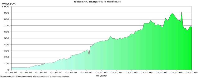 Сумма средств, привлечённых кредитными организациями России путём выпуска векселей, на 1 октября 2009 года составила 680,2 млрд.руб. За сентябрь объем банковских векселей, находящихся в обращении, уменьшился на 0,6%