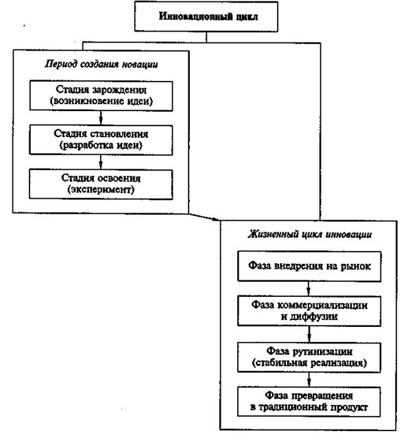Для того чтобы учесть совокупность всех этапов деятельности в период от поиска новых идей до их использования, коммерциализации и распространения, следует ввести понятие "инновационный цикл".