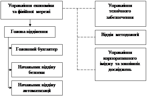 За реалізацію проекту відповідає Управління економіки та філійної мережі, що координує діяльність з іншими управліннями та безпосередньо займається керівництвом по реалізації проекту. На місці для реалізації проекту буде сформована група з 4 фахівців, а саме: голова відділення, головний бухгалтер, начальник відділу безпеки та начальник відділу автоматизації, які контролюватимуть за ходом виконання. Згодом, за умов належного виконання обов’язків, їм буде запропонована робота в новому відділенні. Безпосередню відповідальність за реалізацію проекту на місці перед Управлінням економіки та філійної мережі відповідає директор відділення. Координація з іншими управліннями відбувається через Управління економіки та філійної мережі. Загальна схема субординації зображена на рис.1.