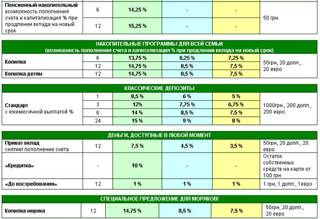 В той же час Приватбанк пропонує диференційовані види депозитів, наприклад, для моряків із ставкою відсотка 14,75 %, мультивалютні з можливістю вільної зміни валюти рахунку із 15 % місячних у гривнях, депозити «Комбі» - щомісячна виплата відсотків + міжнародна картка + кредитний ліміт на карту, також «Приват -вклад», що гарантує вільне користування коштами тощо.