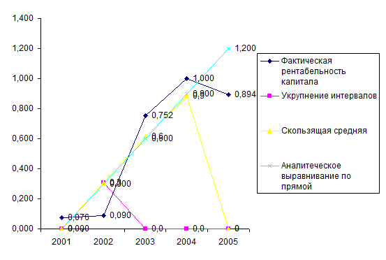 1. В 2006 году рентабельность капитала снизилась на 0,11 или 10,6 % В остальные периоды наблюдается рост данного показателя. В среднем за анализируемый период рентабельность капитала составила 0,6. При этом в среднем прирост рентабельности капитала составил 0,205 или 85,2%. Метод укрупнения интервалов и скользящей средней отражает рост рентабельности капитала с 30% до 90%. Метод выравнивания по прямой показывает общую тенденцию роста рентабельности капитала в среднем ежегодно на 30%.