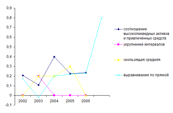 2. За анализируемый период 2002-2006 гг. наблюдается рост соотношения высоколиквидных активов и привлеченных средств, за исключением 2003 и 2005 годов (в 2003 году соотношение высоколиквидных активов и привлеченных средств по сравнению с предшествующим периодом снизилось на 0,1 или 48,1%, а в 2005 году соотношение высоколиквидных активов и привлеченных средств по сравнению с предшествующим периодом снизилось на 0,17 или 43,4%.). В среднем за анализируемый период соотношение высоколиквидных активов и привлеченных средств составил 0,2. При этом в среднем прирост соотношение высоколиквидных активов и привлеченных средств составил 0,007 или 3,1%. Как показывает метод укрупнения интервалов данный показатель в среднем по трехлетиям увеличивается с 20% до 30%. Согласно уравнению прямой соотношение высоколиквидных активов и привлеченных средств в среднем ежегодно возрастает на 1,7%.