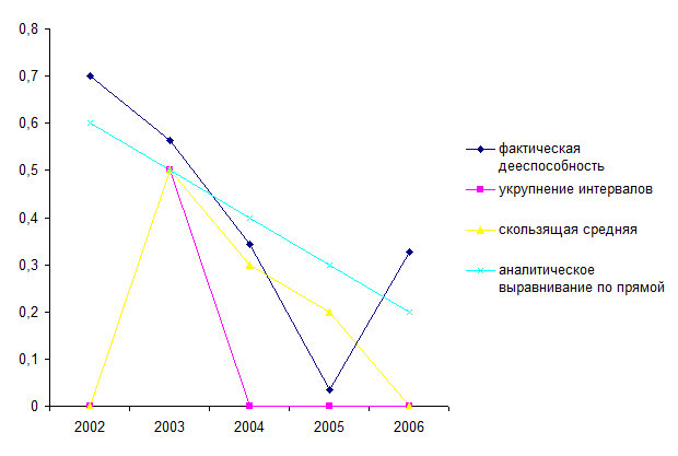 3. На протяжении всего анализируемого периода дееспособность как по сравнению с базисным, так и по сравнению с предшествующим периодами снижается, за исключением 2006 года, в котором по сравнению с 2005г. дееспособность возросла на 0,29 или 861%. В среднем за период 2002-2006 гг. дееспособность составила 0,4. При этом в среднем прирост дееспособности снизился на -0,093 или -17,3%. Согласно расчётам дееспособность снижается в среднем по трехлетиям с 50% до 20%. Формула уравнения прямой показывает общую тенденцию снижения дееспособности ежегодно в среднем на 10%.