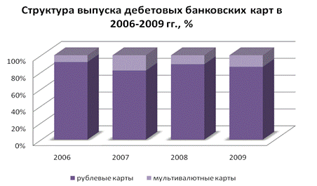 Наибольшей популярностью пользуются дебетовые рублевые карты. Их доля в общем объеме выпуска за 2006 год составила 91, 77 % или же 11578 штук, в 2007 году популярность рублевых дебетовых карт несколько снижается и составляет 81,27 % или 10741 штука, в то время как объем выпуска мультивалютных карт возрастает на 10 % и достигает 17,95 %. Однако уже в 2008 году ситуация изменяется и доля в выпуске рублевых дебетовых карт вновь возрастает и составляет 89,03 %, что в абсолютном выражении соответствует 12228 штукам. За 2009 год Банк выпустил в общем 12886 карт, из них 11128 карт являются рублевыми, а 1758 карт – мультивалютные.