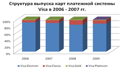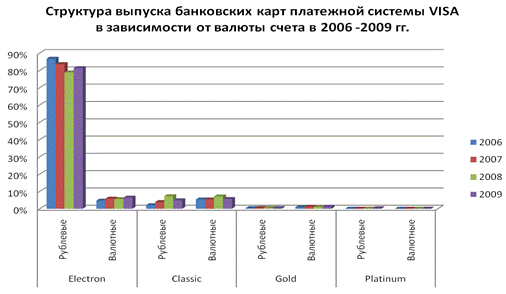 Рис. 4. Структура выпуска банковских карт платежной системы Visa в зависемости от вылюты счета в 2006-2009 гг.