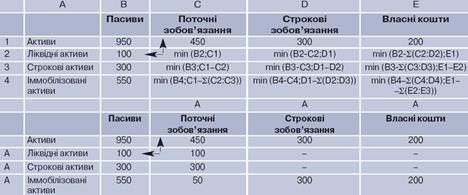 Для застосування матричного методу аналізу ліквідності балансу активи банку необхідно розмістити вертикально в міру зниження їх ліквідності, а пасиви — горизонтально, починаючи з поточних зобов'язань і закінчуючи капіталом. Матриця формується, починаючи з верхньої лівої чарунки (Таблиця 1.5).