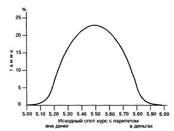 Пример. Дельта 0,65 по опциону "колл" ф.ст./доллар на сумму 50 000 фунтов равняется эквивалентной позиции 32 500 фунтов на спото-вом рынке.