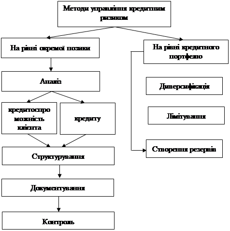 Методи управління кредитним ризиком поділяються на дві групи: 1) методи управління кредитним ризиком на рівні окремої позики; 2) методи управління кредитним ризиком на рівні кредитного портфеля банку. Особливістю перелічених методів є необхідність їх послідовного застосування, оскільки одночасно вони являють собою етапи процесу кредитування. Якщо на кожному етапі перед кредитним співробітником поставлено завдання мінімізації кредитного ризику, то правомірно розглядати етапи кредитування як методи управління ризиком окремої позики.
