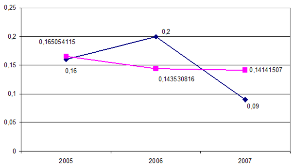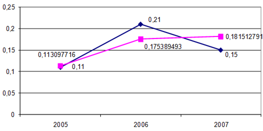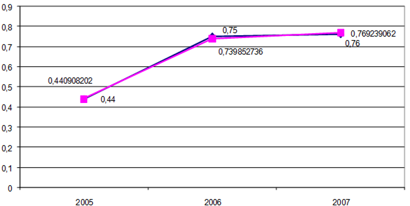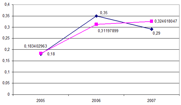 За допомогою методу кореляції і автокореляції, було розраховано прогноз доходності операцій банку ЗАТ КБ «ПриватБанк». На доходність ЗАТ КБ «ПриватБанк» значний вплив мають активи, які у 2006-2007 роках значно зростають.